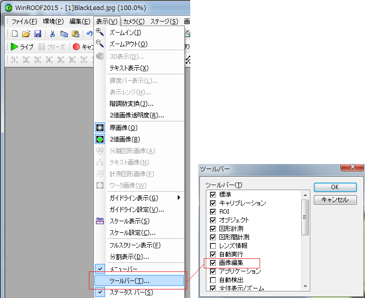 ペンツールなどのボタンが画面に表示されていない場合、表示メニューより"ツールバー"を選択し、"画像編集"のチェックがONになっているかご確認下さい。