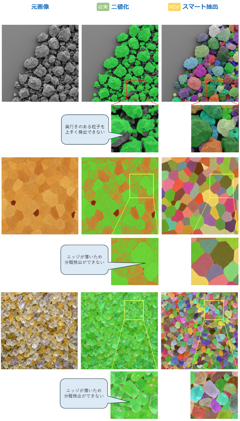 『スマート抽出』は二値化などの従来の画像処理技術では検出が難しかった、 "密集した"粒子や"エッジの薄い"金属組織などの画像も、簡単・正確に抽出できるAI機能です。電子顕微鏡(SEM)や金属顕微鏡、顕微鏡以外の撮影装置など、様々な画像で利用でき対象の解析をサポートします。